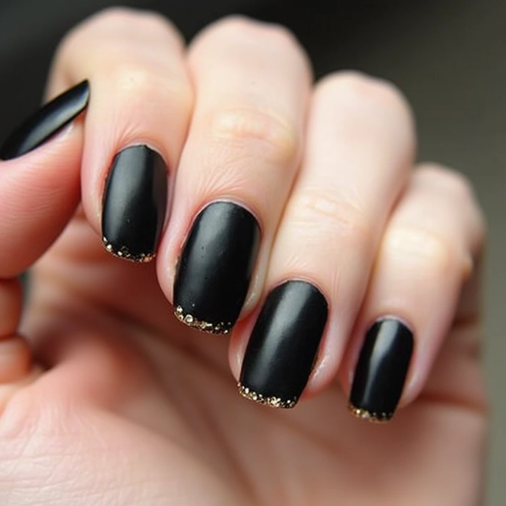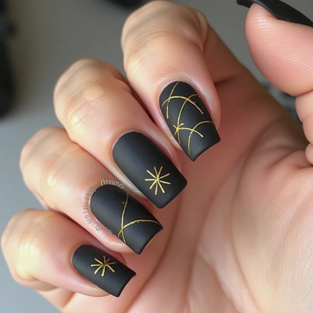 - Matte Black with Gold Detailing: A matte black base with thin gold stripes or dots adds a delicate touch of glamour to your nails without being over the top. This design is perfect for those who want to keep their look sleek and professional.