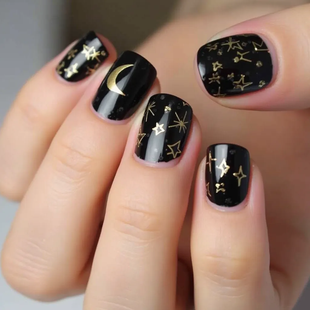 - Celestial Black and Gold Nails: If you want something fun and whimsical, try black nails with gold stars or moon patterns. This design adds a touch of magic and can be especially fitting for festive events like New Year’s Eve or holiday parties.