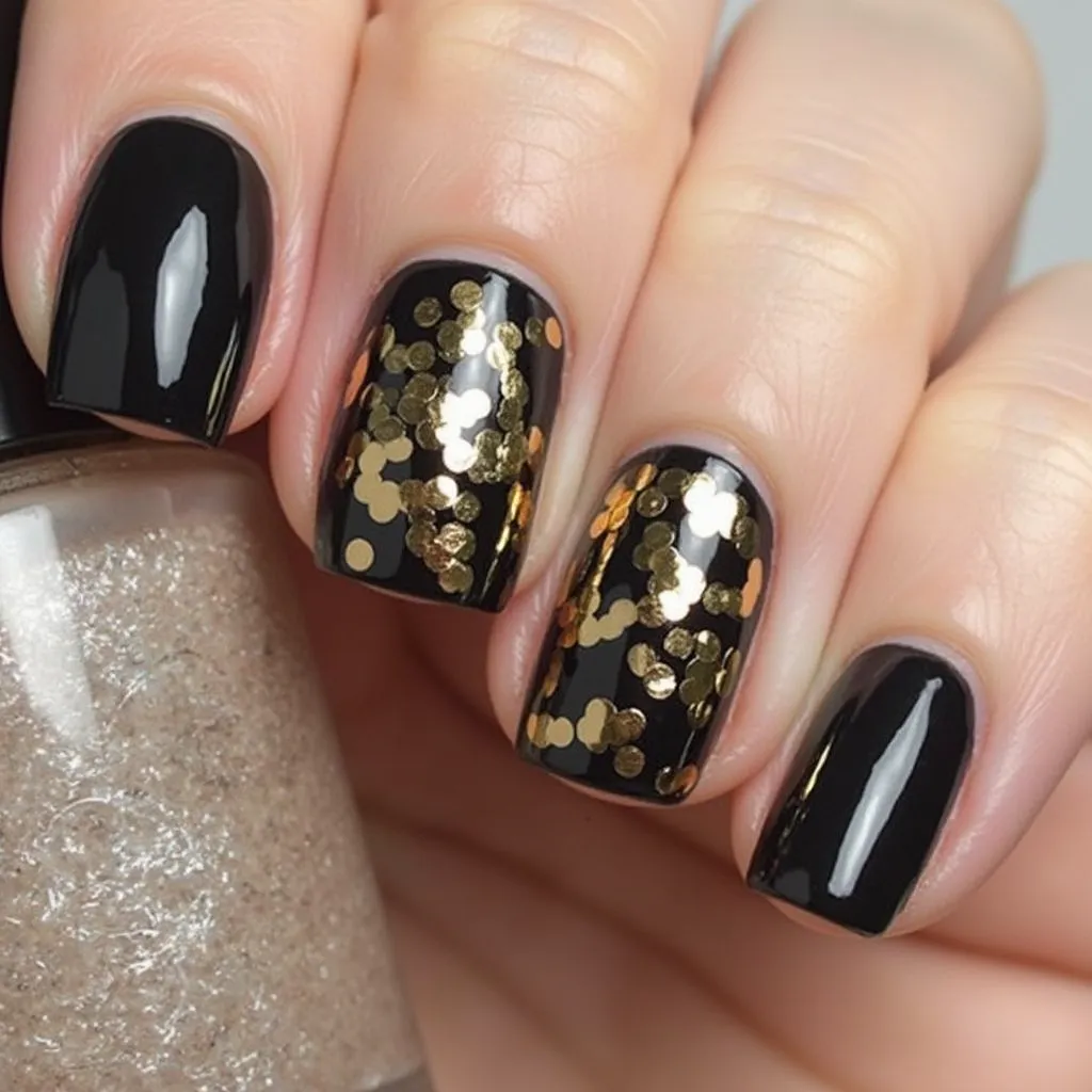 - Gold Glitter Ombre Effect: Another stunning design is the gold glitter ombre, where black fades into a shimmering gold at the tips of your nails. This design is glamorous and eye-catching, making it perfect for special events.