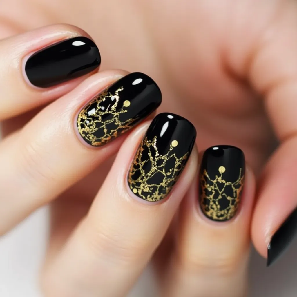 - Gold Leaf Detailing: For a more natural and organic look, try adding gold leaf to your black nails. Gold leaf flakes create a luxurious, textured effect that is both modern and sophisticated.