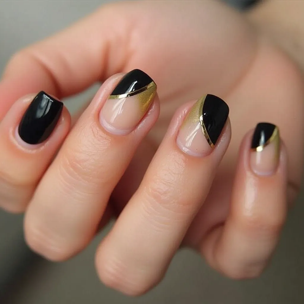 - Half-and-Half Black and Gold Design: For a simple yet trendy look, try a half-and-half design where one side of the nail is black and the other half is gold. This minimalist design offers balance and elegance.