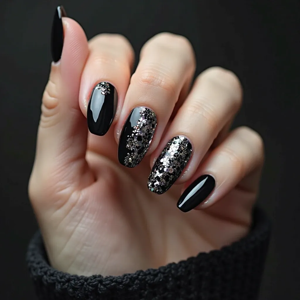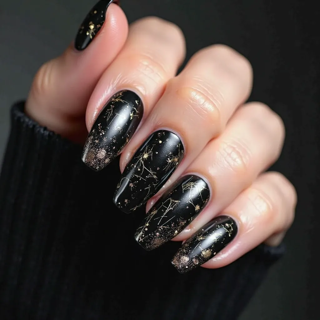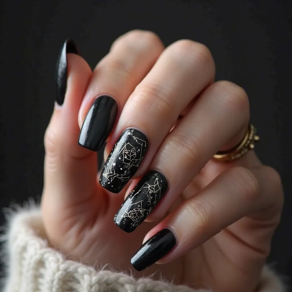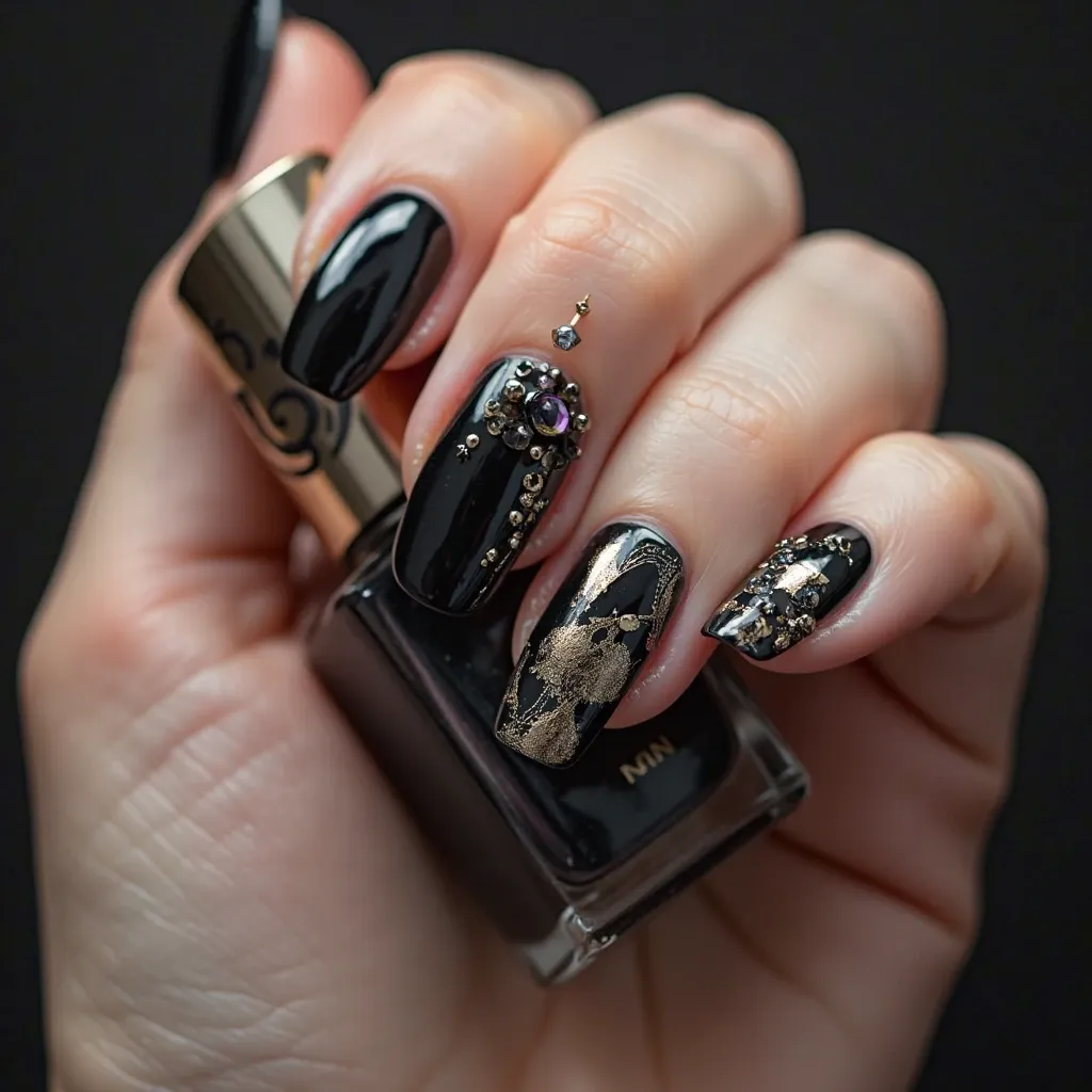 - Textured black designs – Create 3D effects with velvet powder, beads, or nail stamps