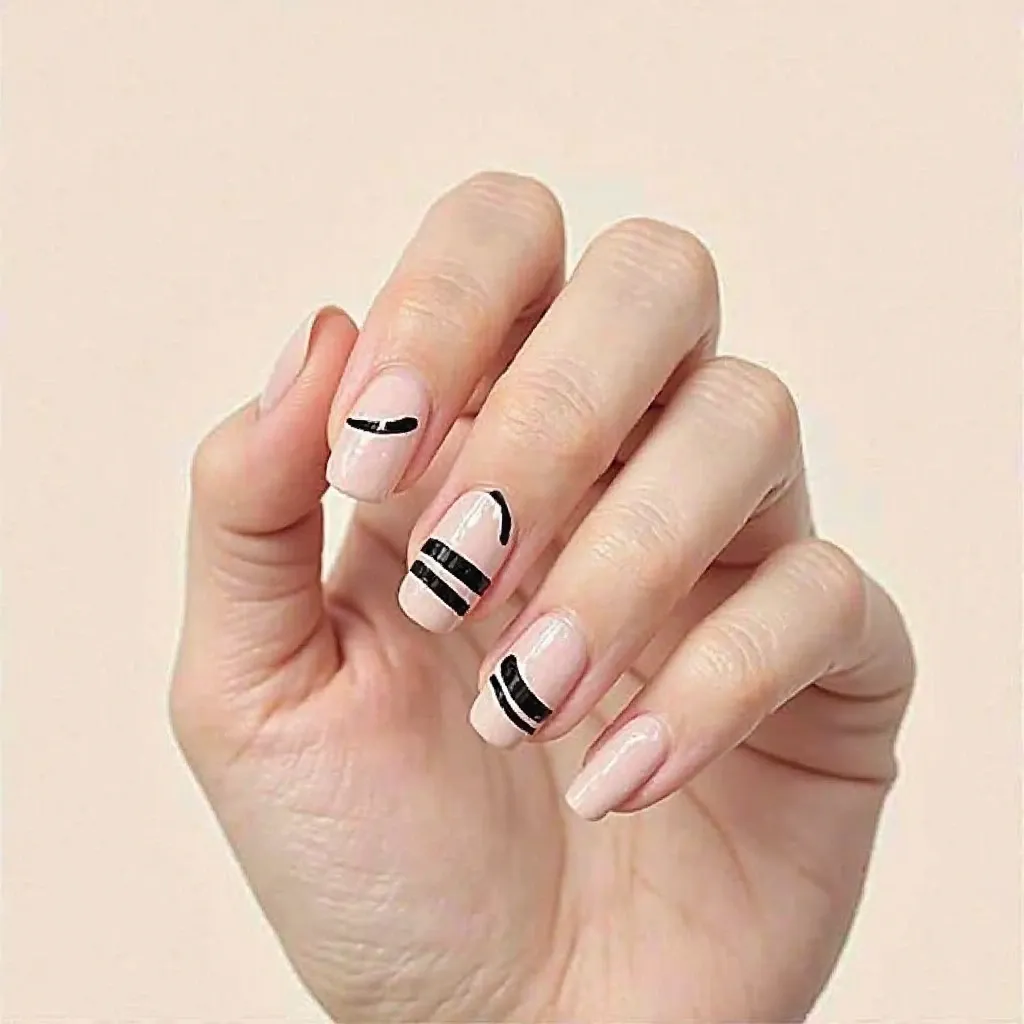Freehand a swoop, line, or diagonal slash in black over a bare nail. Each nail can be different—imperfection adds personality.