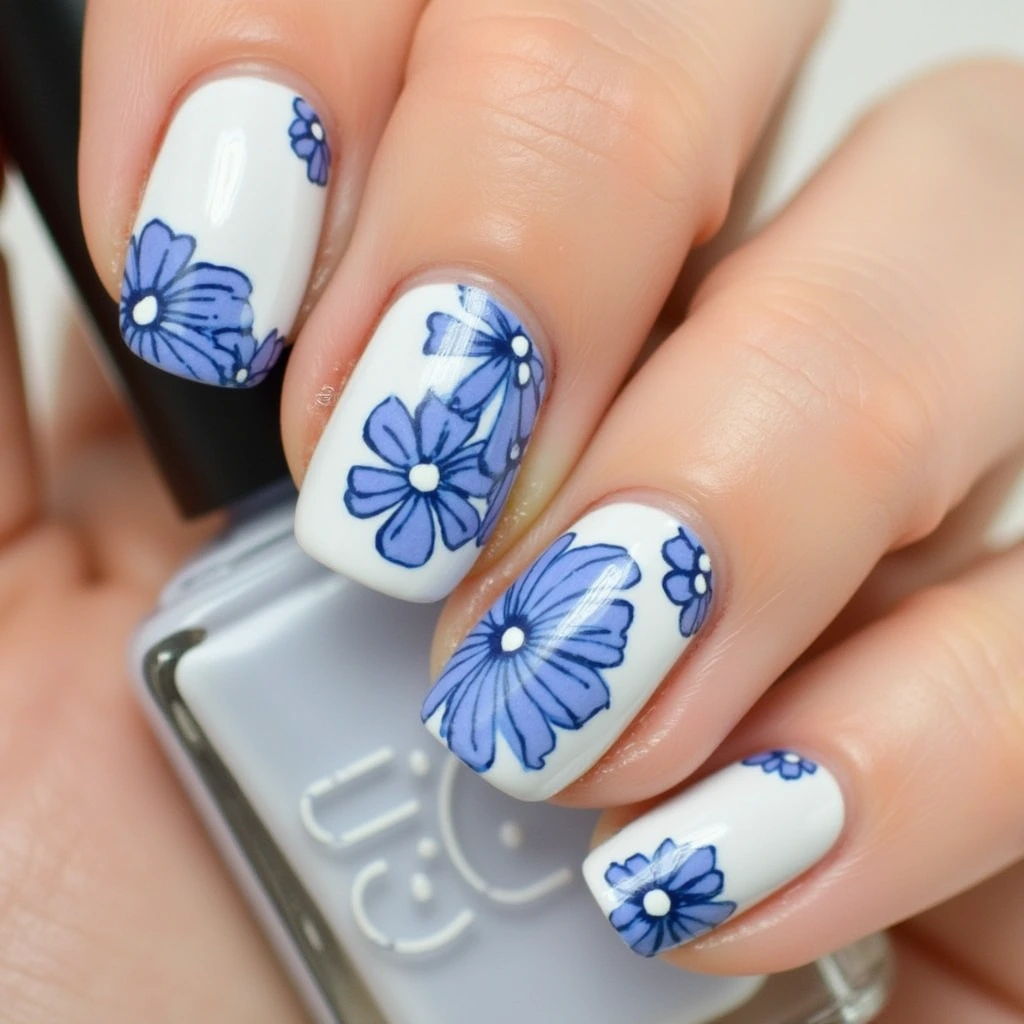 - Use a dotting tool or a fine brush to create flowers on your nails. You can use white, dark blue, or even gold to highlight the flowers.