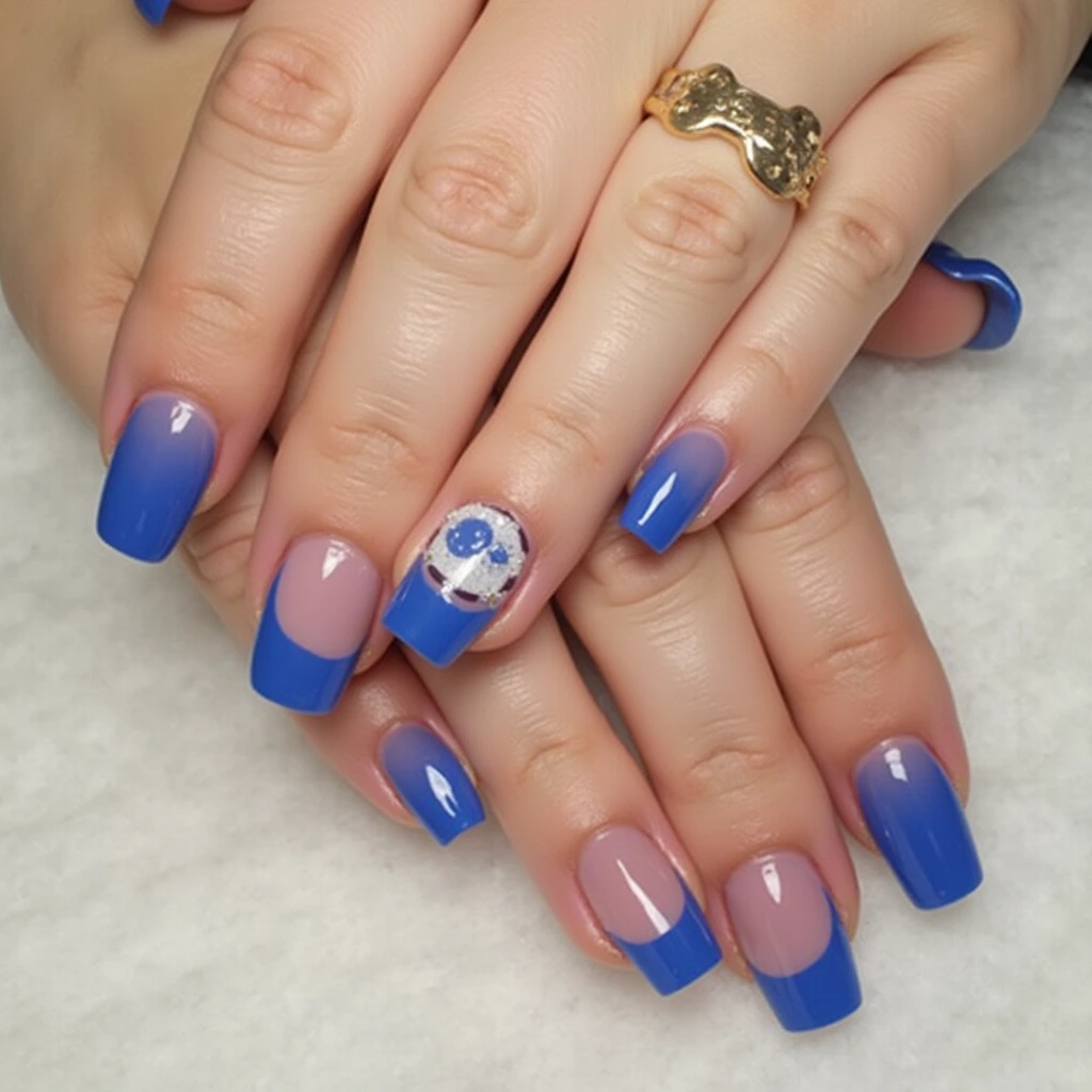 The French manicure is a classic design, but when you swap the traditional white tips for blue, you create a modern and chic look that’s perfect for any occasion.