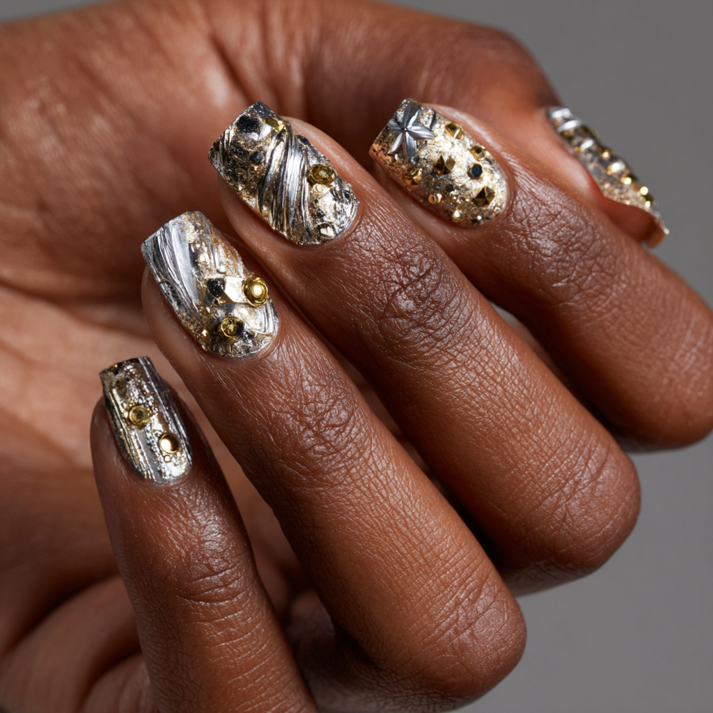Few looks shine brighter than a mixed-metal manicure. In this design, silver and gold chrome are paired across different styles, including 3D stars, textured swirls, and abstract embellishments. What makes the set stand out even more is the clever use of negative space, adding balance to the bold metallic finish.