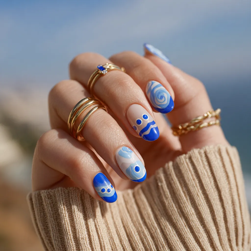 Another simple trick to make a mismatched manicure feel deliberate is to stick to a consistent color story. Blue and nude create an ideal short, beachy mismatched manicure. Highlight your favorite designs—whether a single French tip, tie-dye swirl, or checkered pattern—to keep the look cohesive.