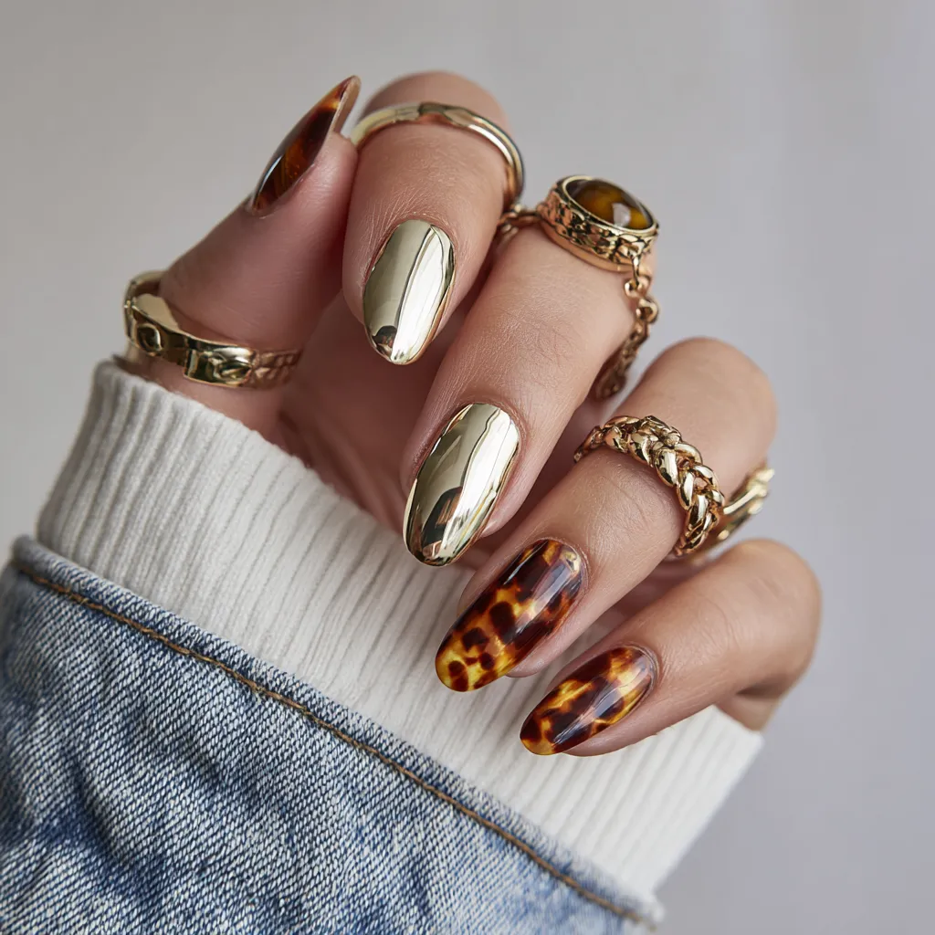 Gold nails don’t always need to be flashy, and tortoise shell patterns don’t have to feel old-fashioned. For a contemporary twist, pair a soft, muted gold with a sleek, glossy tortoise design.