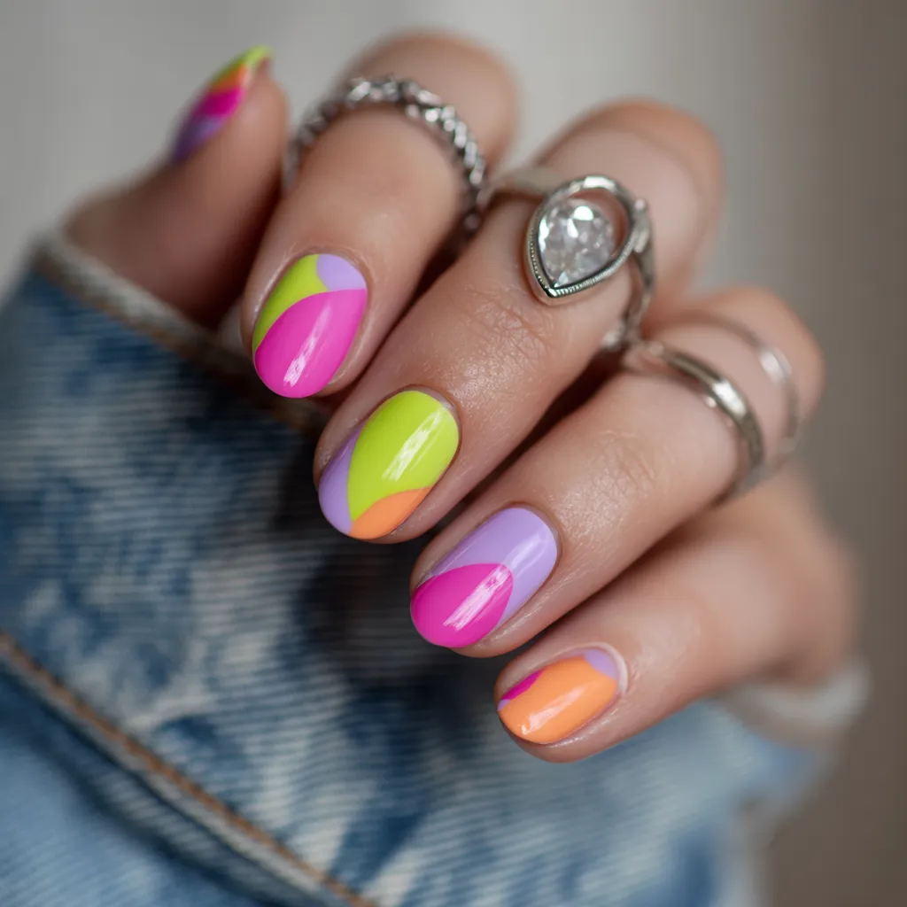 A bold color palette instantly brings a cheerful vibe to your manicure. Play around with your favorite neon shades and pair them with a reverse French tip. The outcome is a lively, eye-catching look that’s surprisingly easy to recreate.