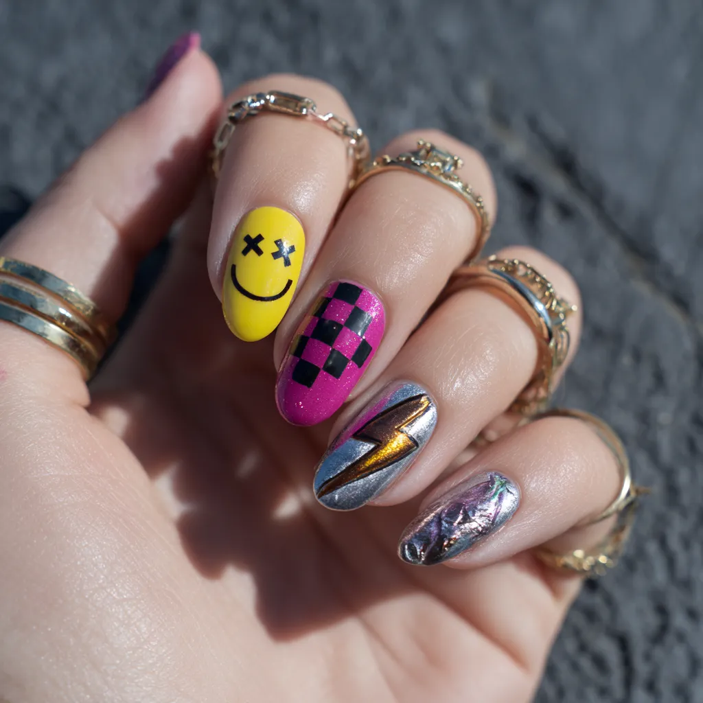 Tap into grunge-inspired glam with playful details like lightning bolts, checkerboard patterns, and a smiley face accent. The mix of metallic shades and soft lines ties the look together, giving it an edgy yet cohesive vibe.