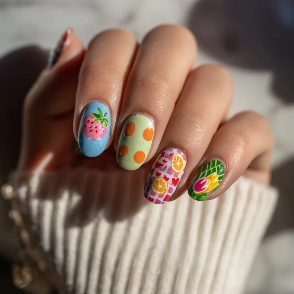 When you’re unsure what to do, draw inspiration from current nail trends and mix them together. In this whimsical short mismatched manicure, the artist combined the fisherman trend, farmers market aesthetic, and floral accents for a playful, eye-catching set.