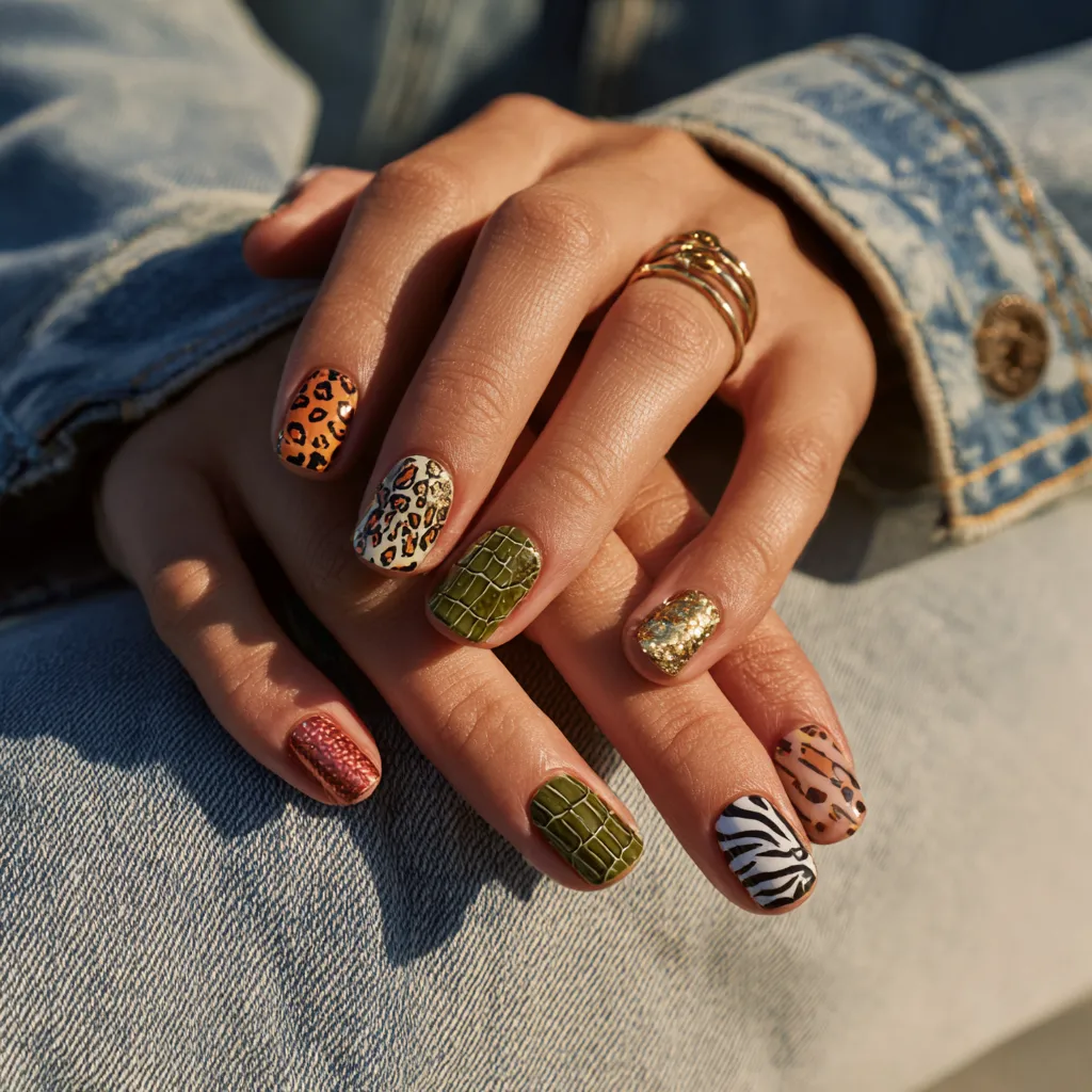 A simple way to make a mismatched manicure look cohesive is to follow a unifying theme. For instance, pick a different animal print for each finger. This instantly ties the look together while still letting you show off a variety of patterns and textures.