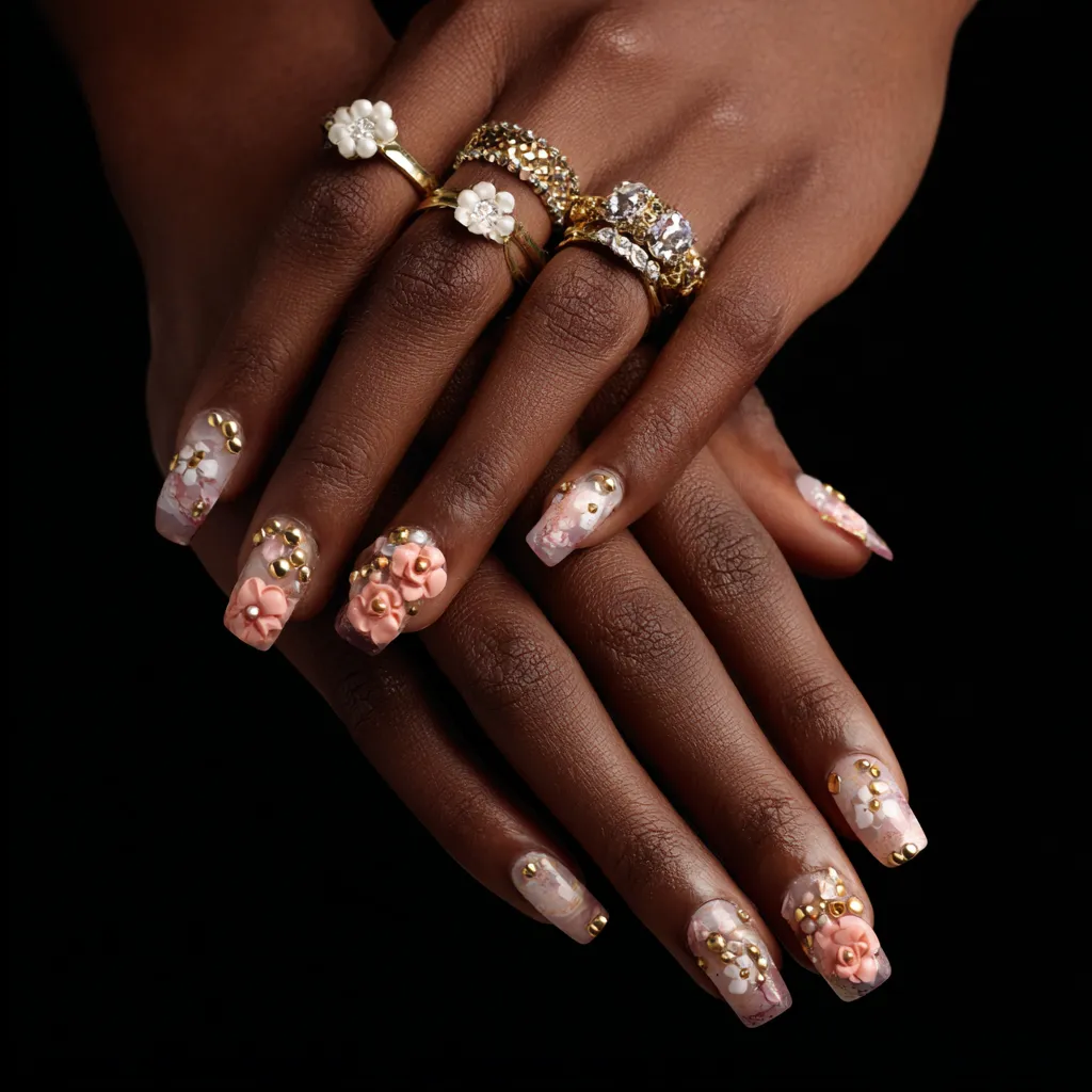Caramel is a versatile shade that works beautifully in any season. Enhance the warm neutral with touches of gold beads, pops of color, and abstract details. In this look, the artist added pink aura effects and 3D floral accents to elevate the short manicure with extra dimension.