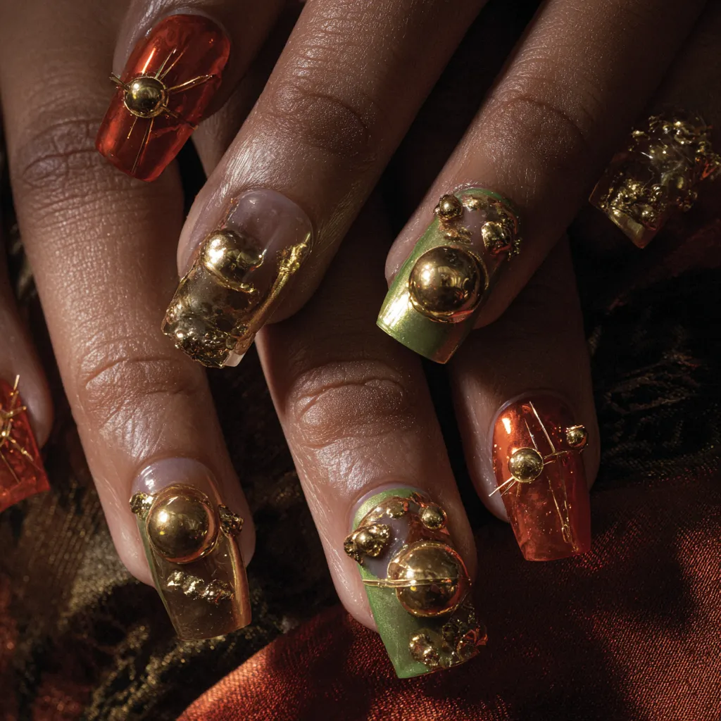 Red and green don’t have to feel purely festive. Elevate this combination in a mismatched manicure by adding carefully placed gems and touches of gold-plated builder gel. The goal is to create nails that resemble minimalist jewelry, using accents thoughtfully and sparingly.
