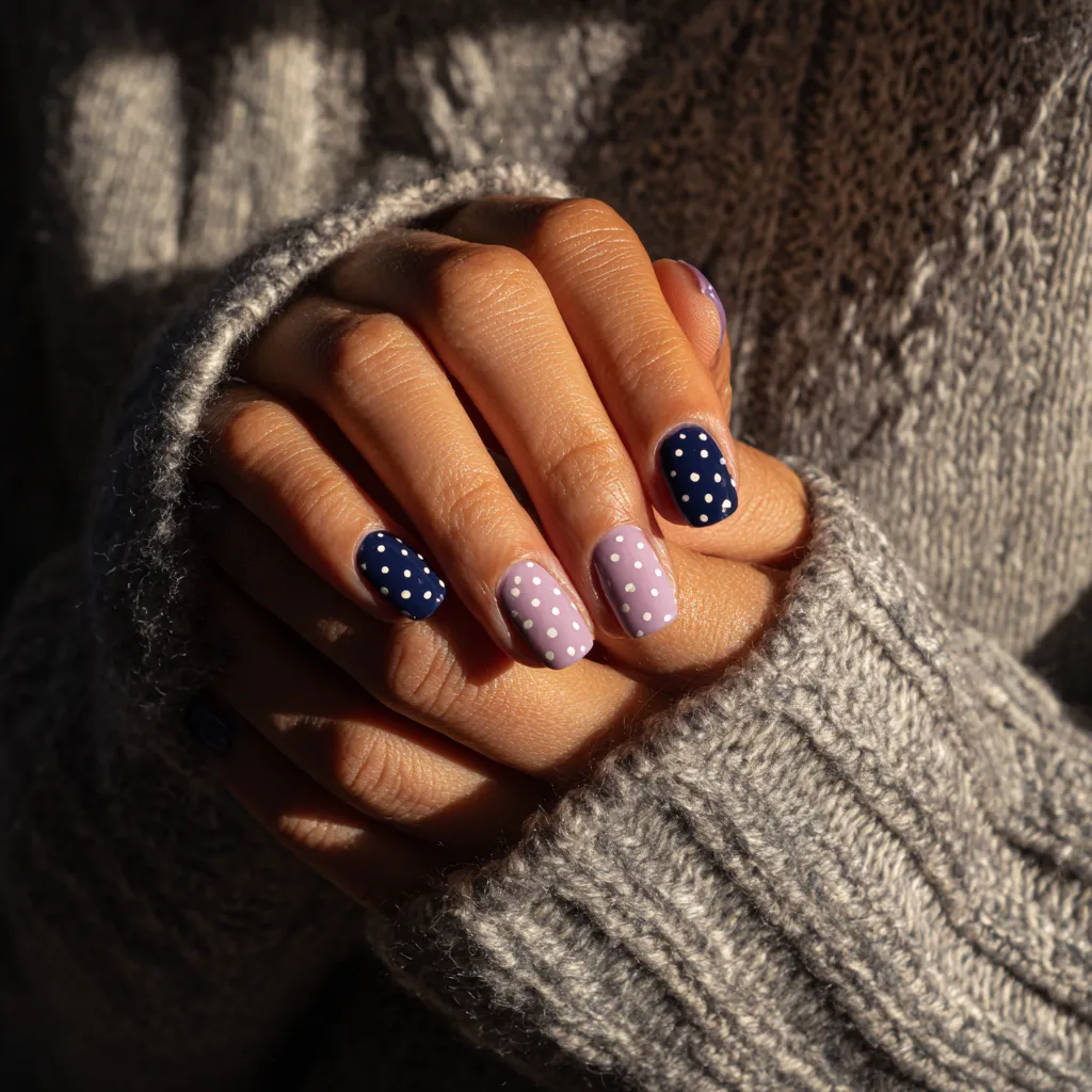 Polka dots remain a classic because they never go out of style. Begin by selecting your favorite color pairing. On your left hand, apply the lighter shade as the base and add scattered dots in the darker tone. For your right hand, flip the colors to create a fun, inverted effect.