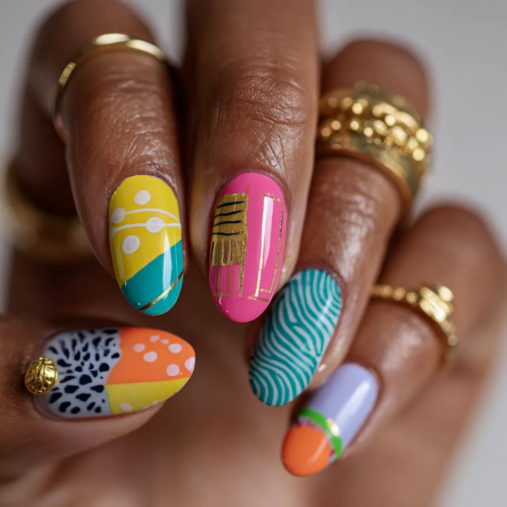 Abstract nail art doesn’t have to be elaborate to make an impact. By painting freely, you can create a look that’s completely your own. In this design, each nail features a different color palette, highlighting the playful mismatched effect.