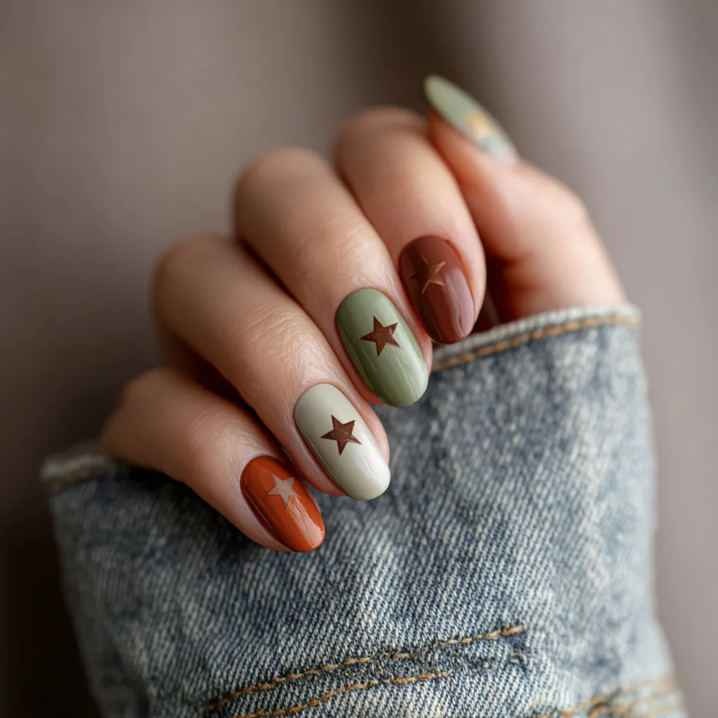 Even though brown and blue sit far apart on the color wheel, they make a striking pair. In this look, the nail artist maintained a uniform starburst pattern while simply switching up the shades for each element. Adding a touch of soft peach helps balance the design and introduces a gentle contrast.